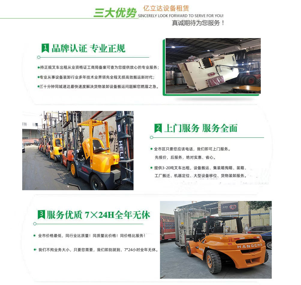 亿立达设备租赁有限公司是工商局准许的北京信息科技大学专业叉车出租公司,公司本着诚信、服务、效率、创新的经营理念,用精湛的技术,真诚的服务,为众多客户提供优质的服务,同时获得信赖与支持。专业提供北京信息科技大学3-20吨叉车出租、叉车租赁、设备搬运、集装箱掏箱装箱、机器移位定位、货物装卸、工厂搬迁、安全可靠,收费透明,价格便宜,随叫随到,24小时上门服务!本公司叉车吊车师傅对各种设备搬运装卸都有深刻探讨和研究。很多的疑难设备搬运,通过我公司的叉车师傅都能迎刃而解。对各种进口设备、国产机器、大型设备搬迁、高难度搬迁、各种精密仪器、医疗设备、科研设备等都能搬运; 提供全市 24 小时上门装卸搬运服务。同时提供厂房搬迁服务。 ...